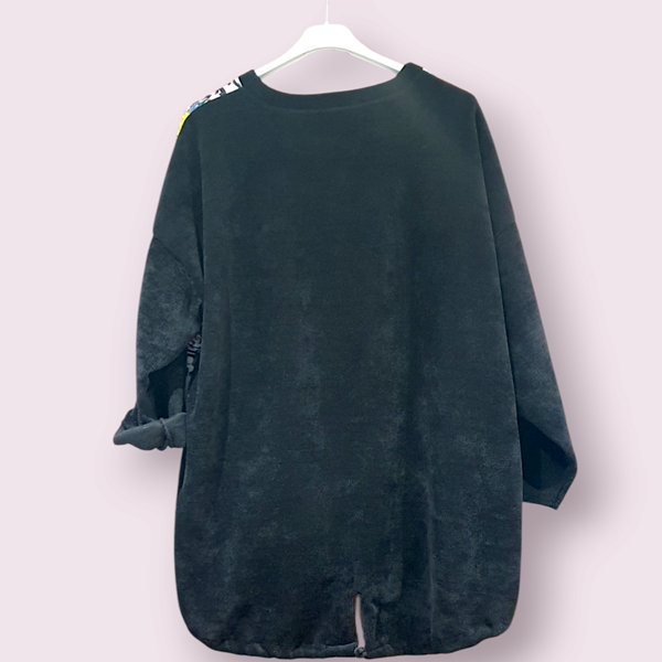 Parte delantera en tejido de punto frío, parte trasera y mangas de chenilla, cordón en bajo para ajuste
