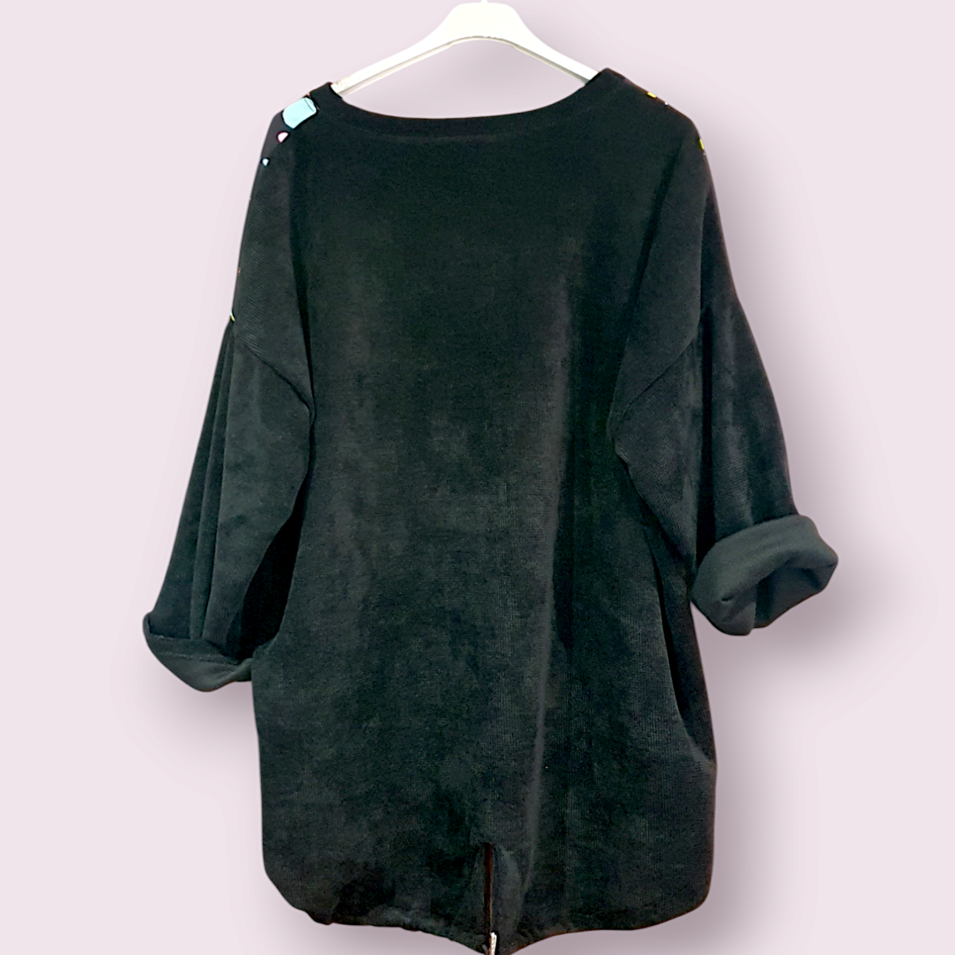 Parte delantera de punto frío, Parte trasera y mangas de chenilla, cordon en bajo para ajuste