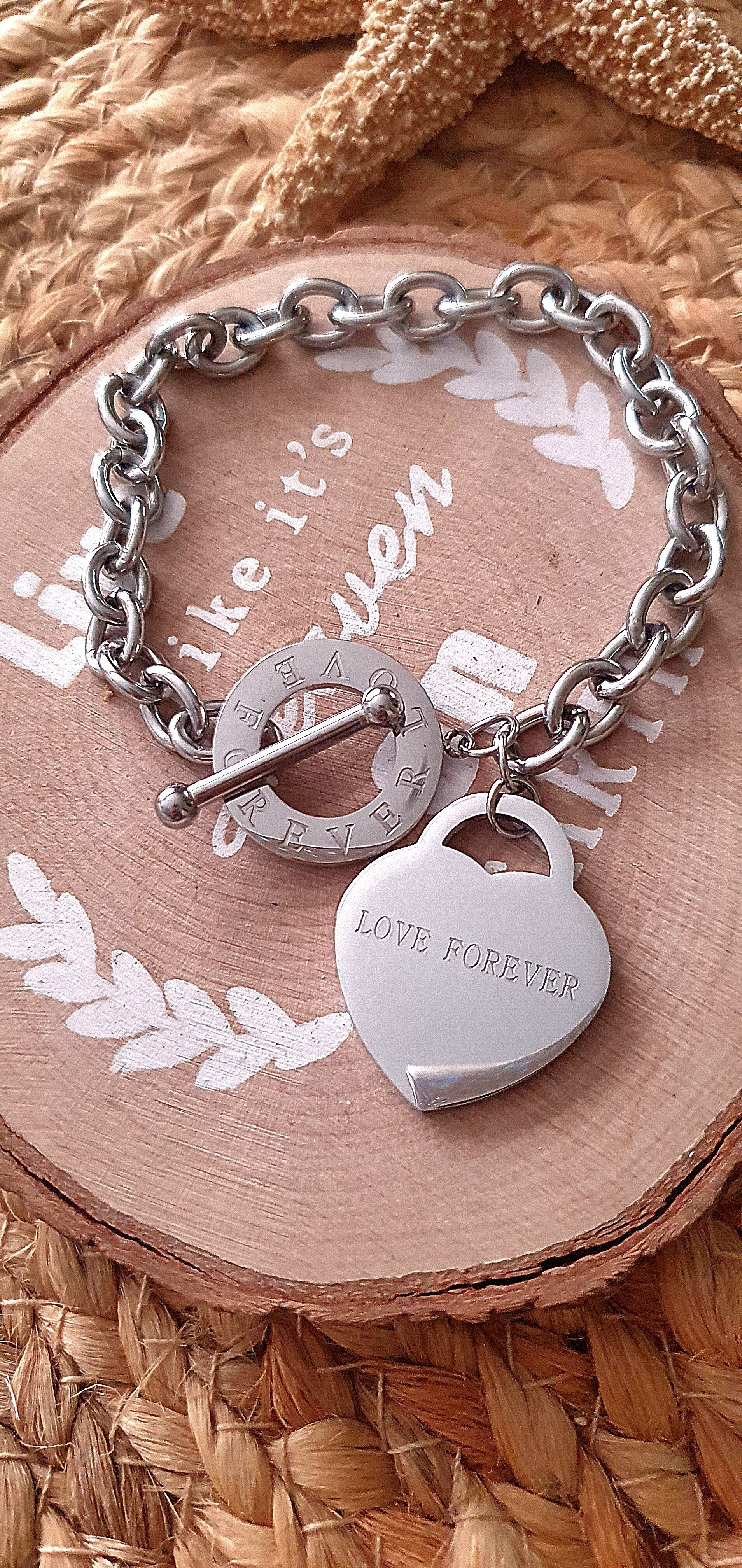 En acero con eslabones , detalle de colgante en corazón grabado con palabra Forever