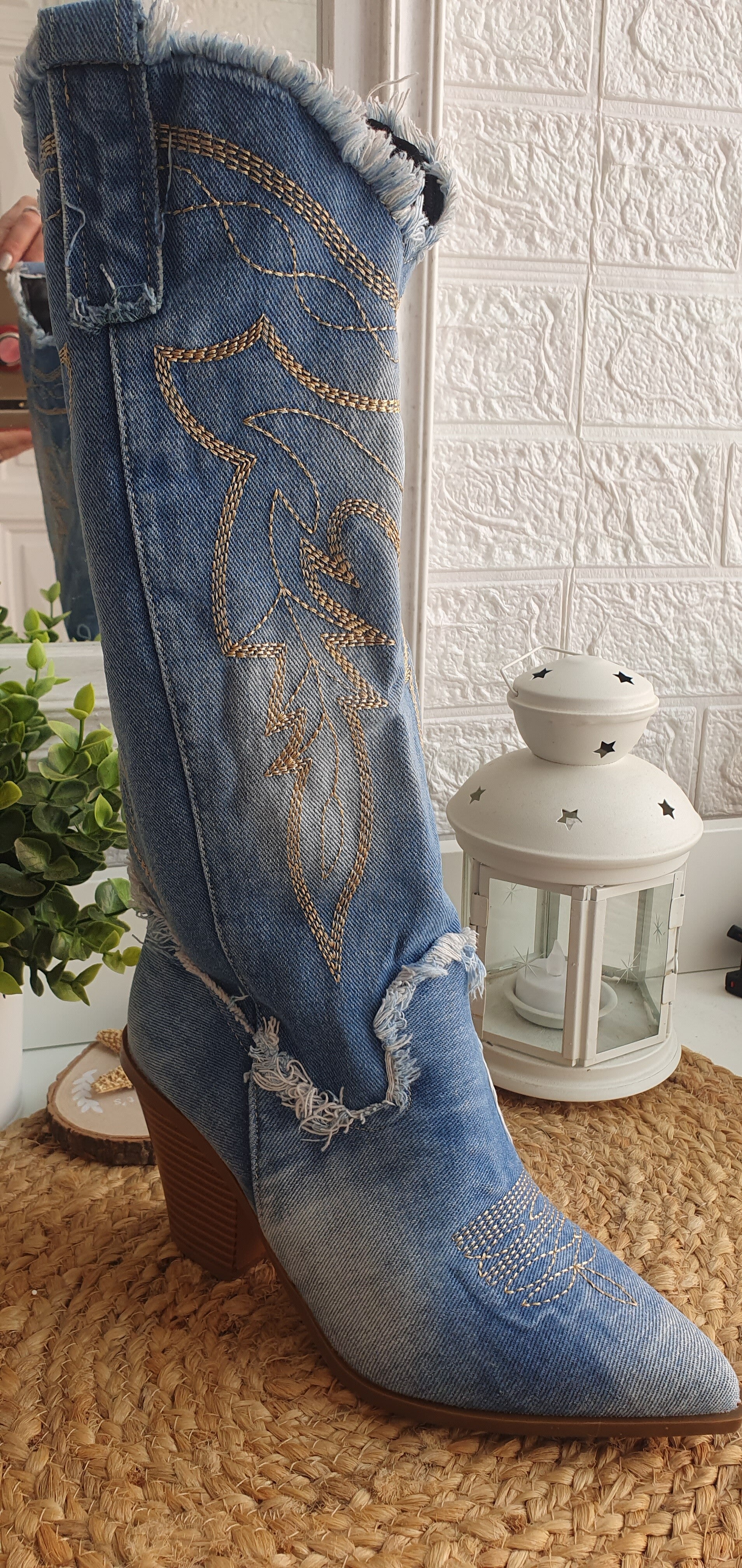 Botas camperas , tejido vaquero con detalles bordados en camel, recomendable pedir un número más del habitual