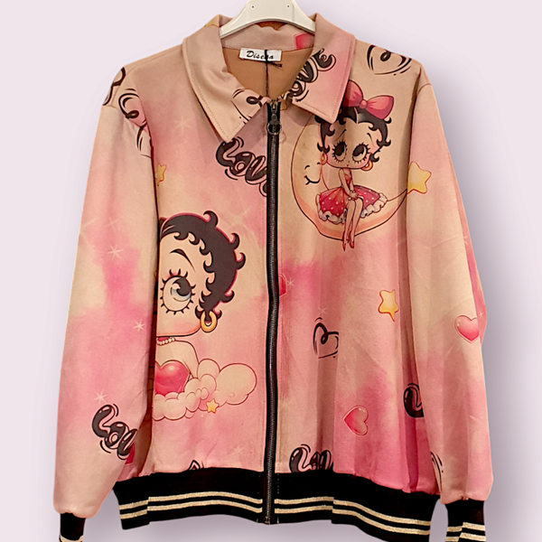 Cazadora bomber confeccionada en antelina con estampado de Betty Boop sobre fondo rosa , ideal para entretiempo