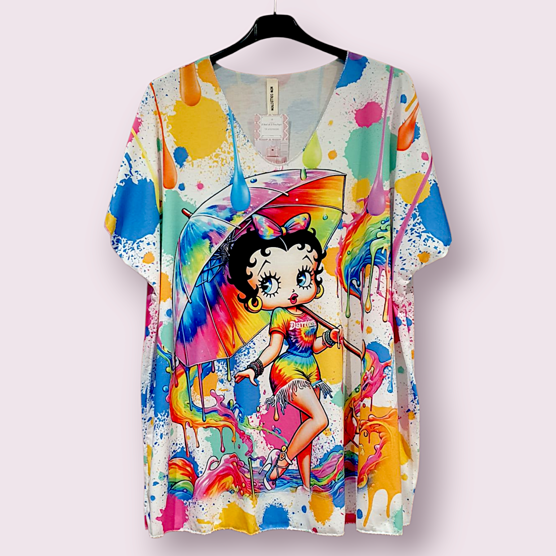 Camiseta confeccionada en punto fino con estampado de Betty Boop sobre fondo colorido , manga corta , cuello de pico