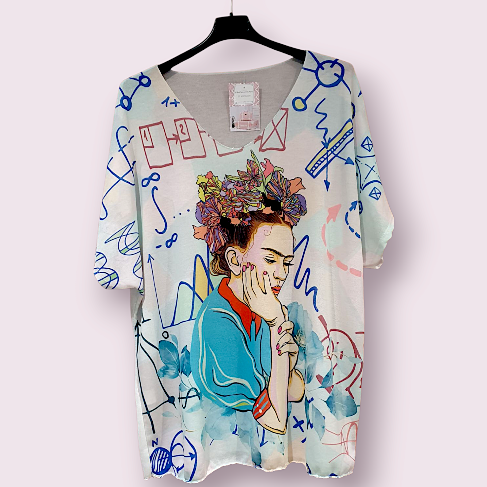 Confeccionada en punto fino con estampado de Frida Kahlo, cuello de pico , manga corta