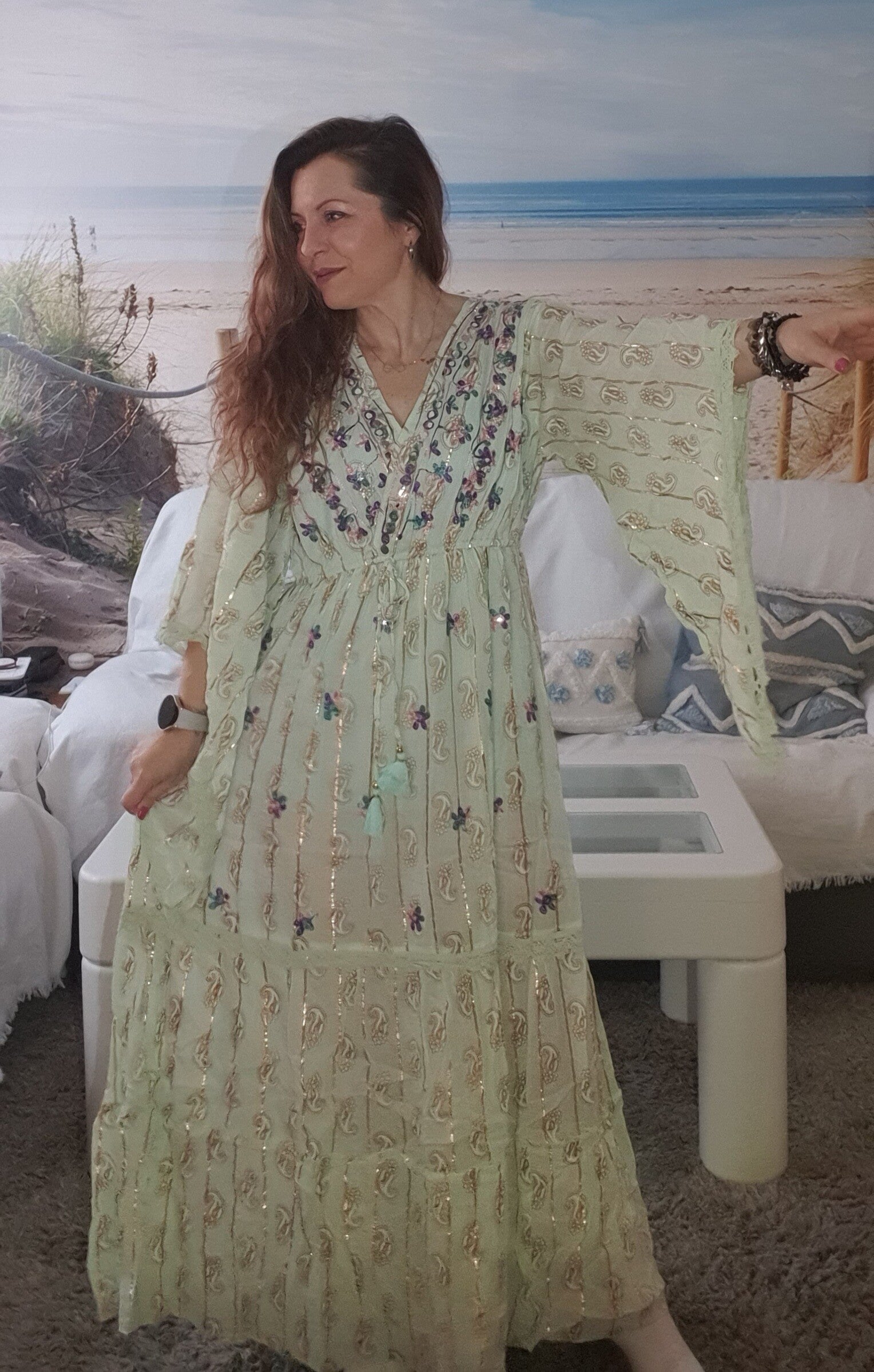 Confeccionado en rayón, escote cruzado , manga de murciélago acabada en puntilla , goma en la cintura