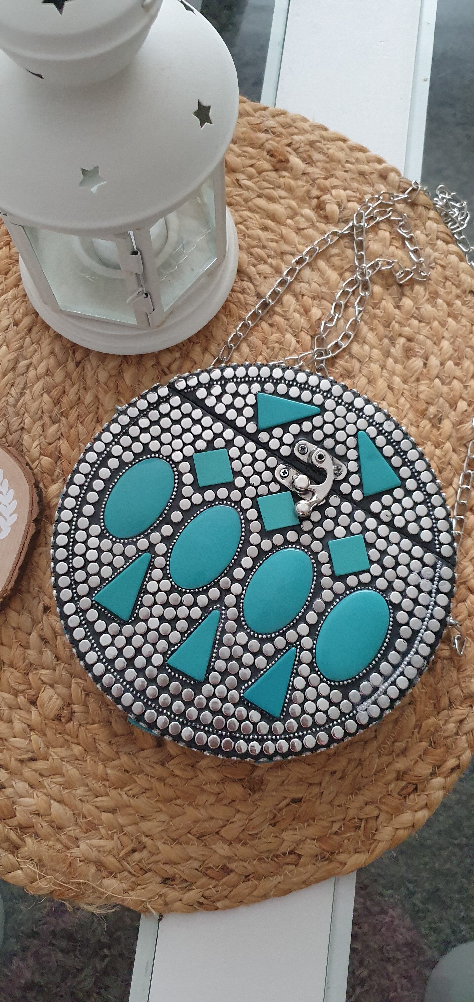 Bolso rígido circular , en plateado con detalles en azul verdoso , cadena al hombro