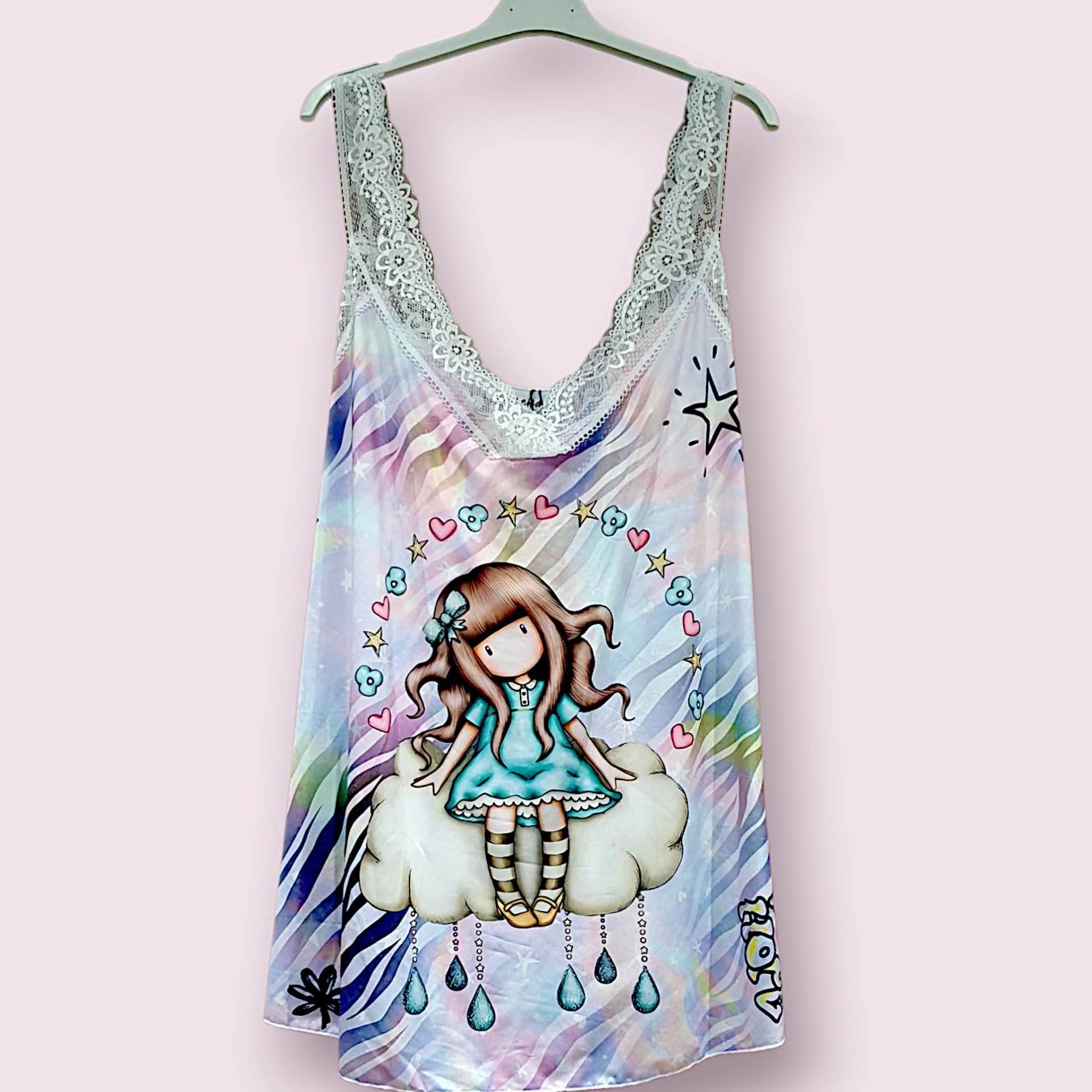 Camisa lencera confeccionada en punto frío, estampado muñeca Gorjuss sobre tonos pastel