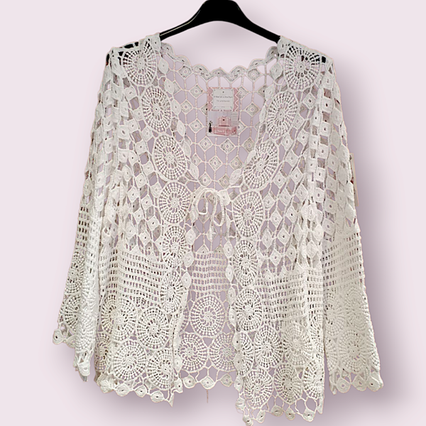 Chaqueta de crochet disponible en varios colores , cierre delantero mediante lazada del mismo tejido