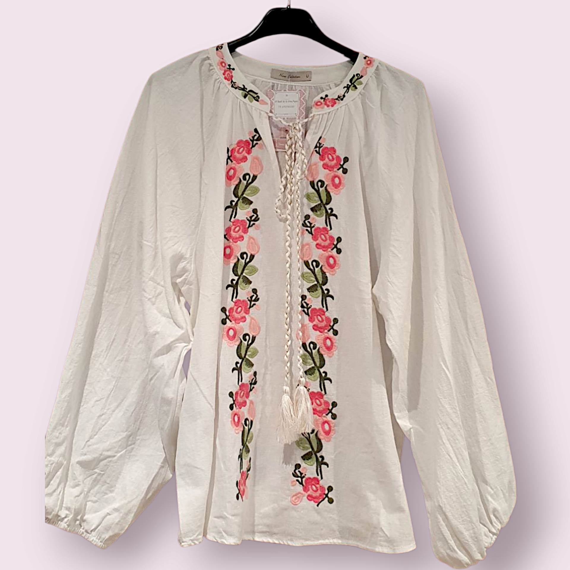 Camisa confeccionada en algodón con bordados de flores, manga larga fon goma en el puño