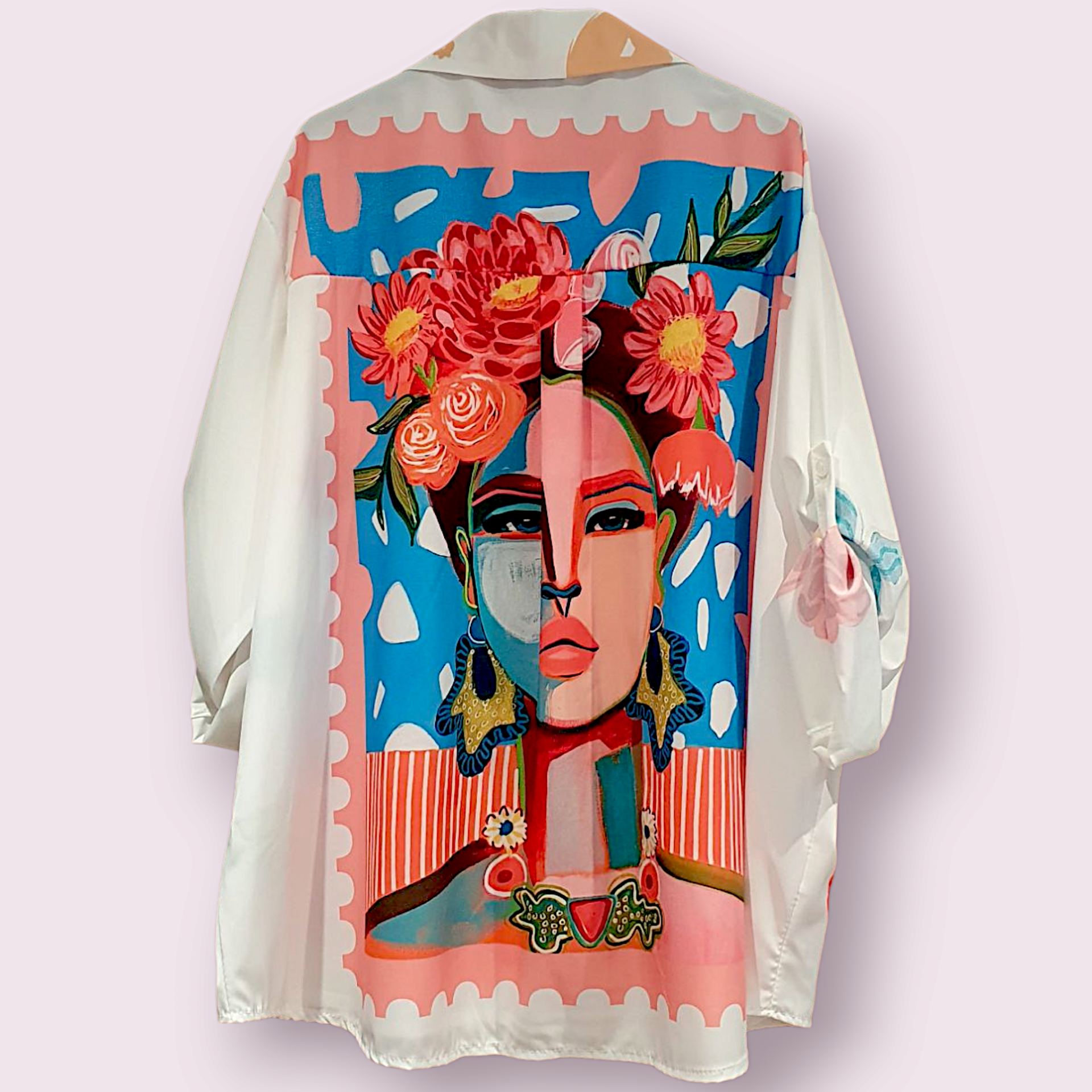 Confeccionada en poliester , manga con trabillas ,estampado de Frida Kahlo sobre fondo blanco