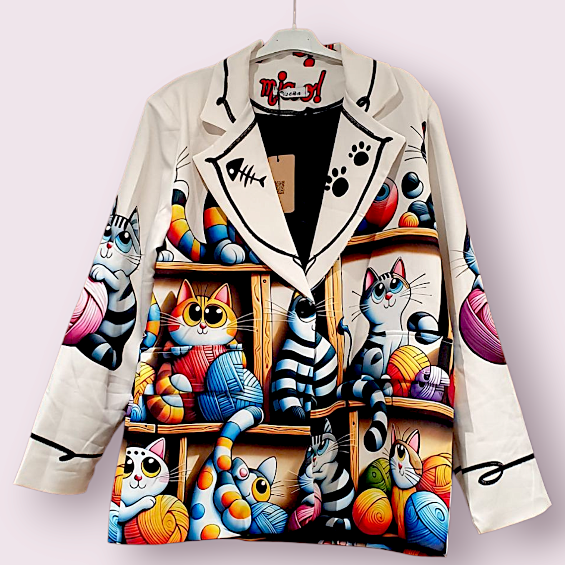 Americana con estampado de gatitos sobre fondo blanco , detalle en la solapa
