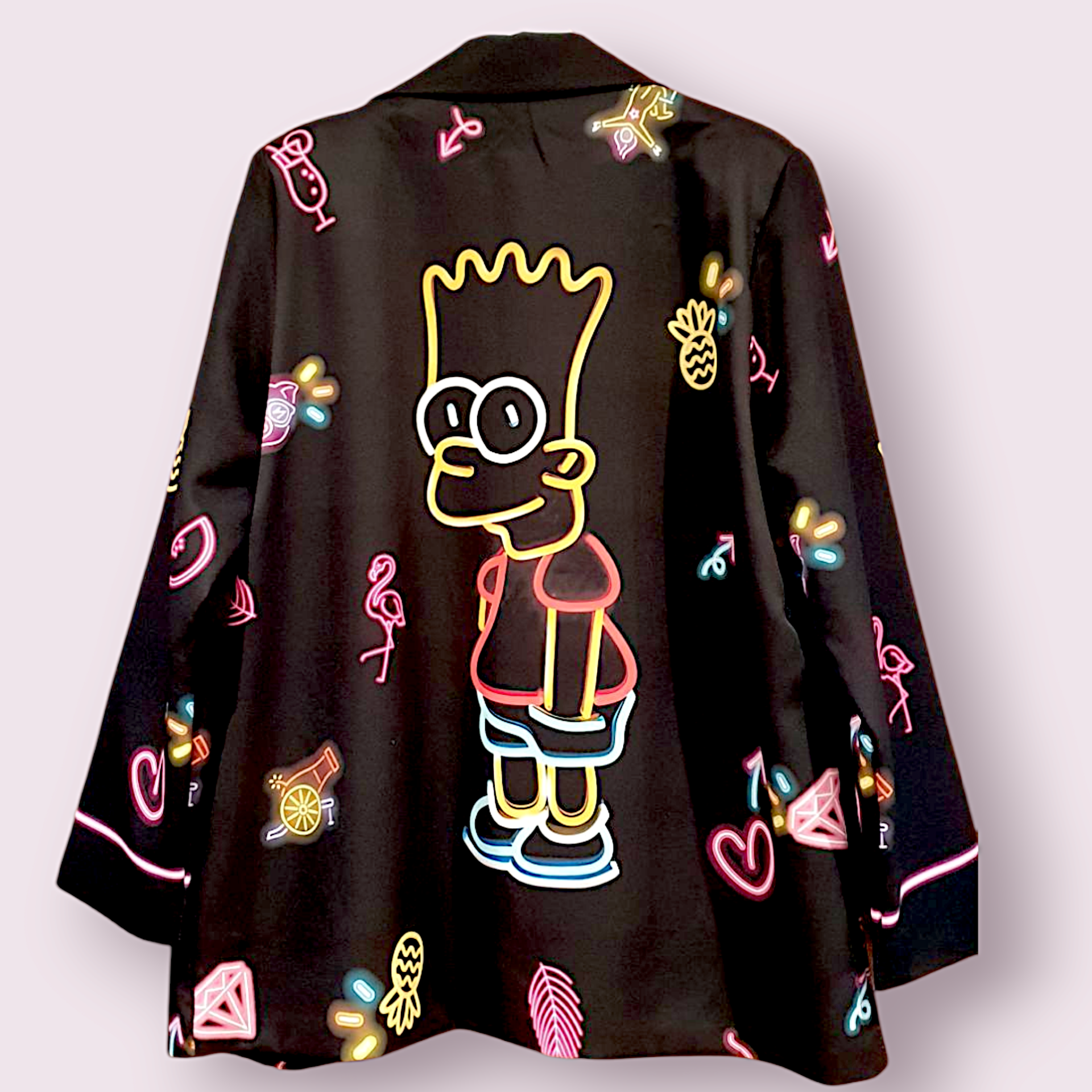 Estampado de Bart Simpson sobre fondo negro con letras y dibujos neón