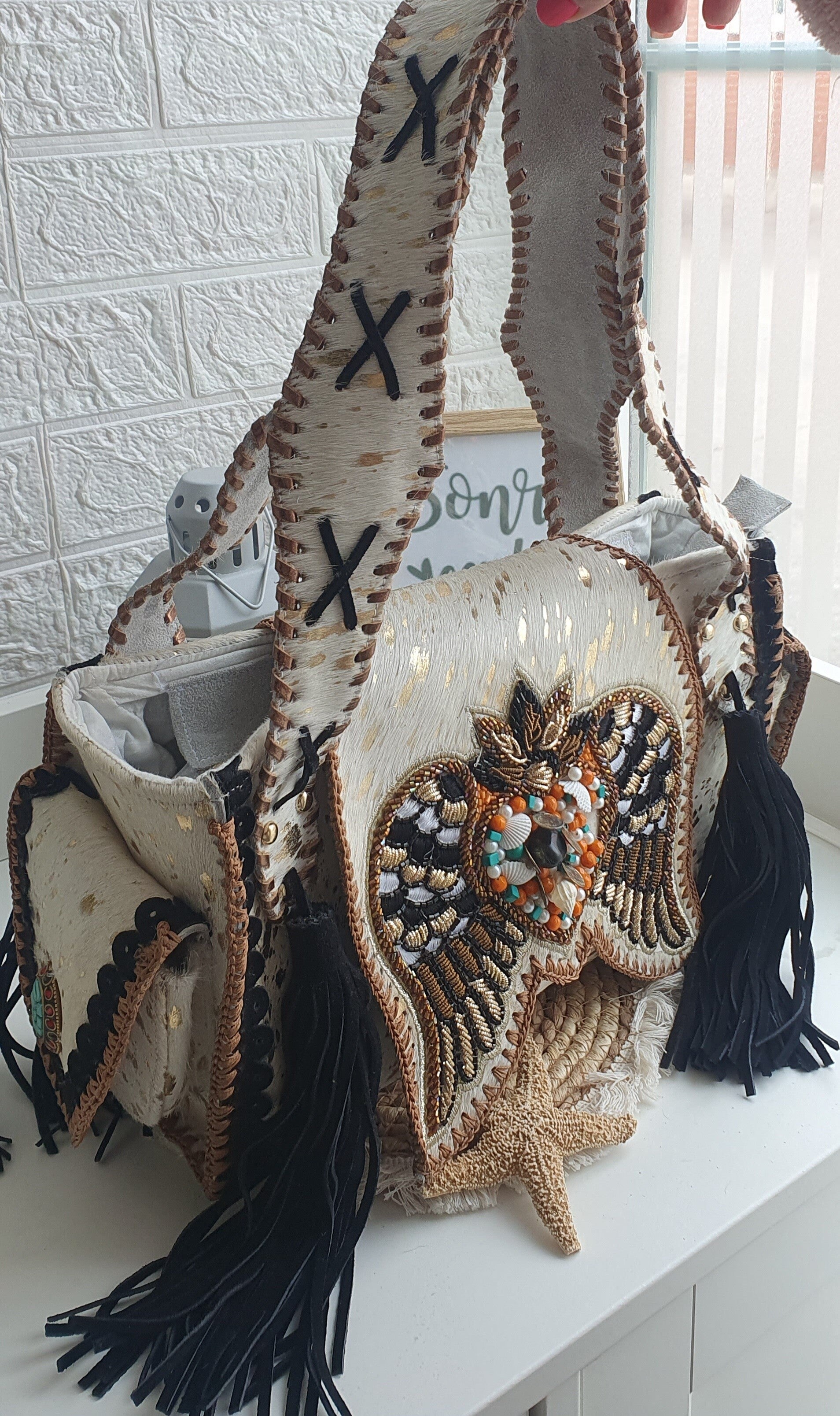 Confeccionado y bordado a mano , de piel y pelo natural , detalles de abalorios y flecos , forrado interior , bolsillos laterales , cierre con cremallera , solapa con automático, estilo bohochic