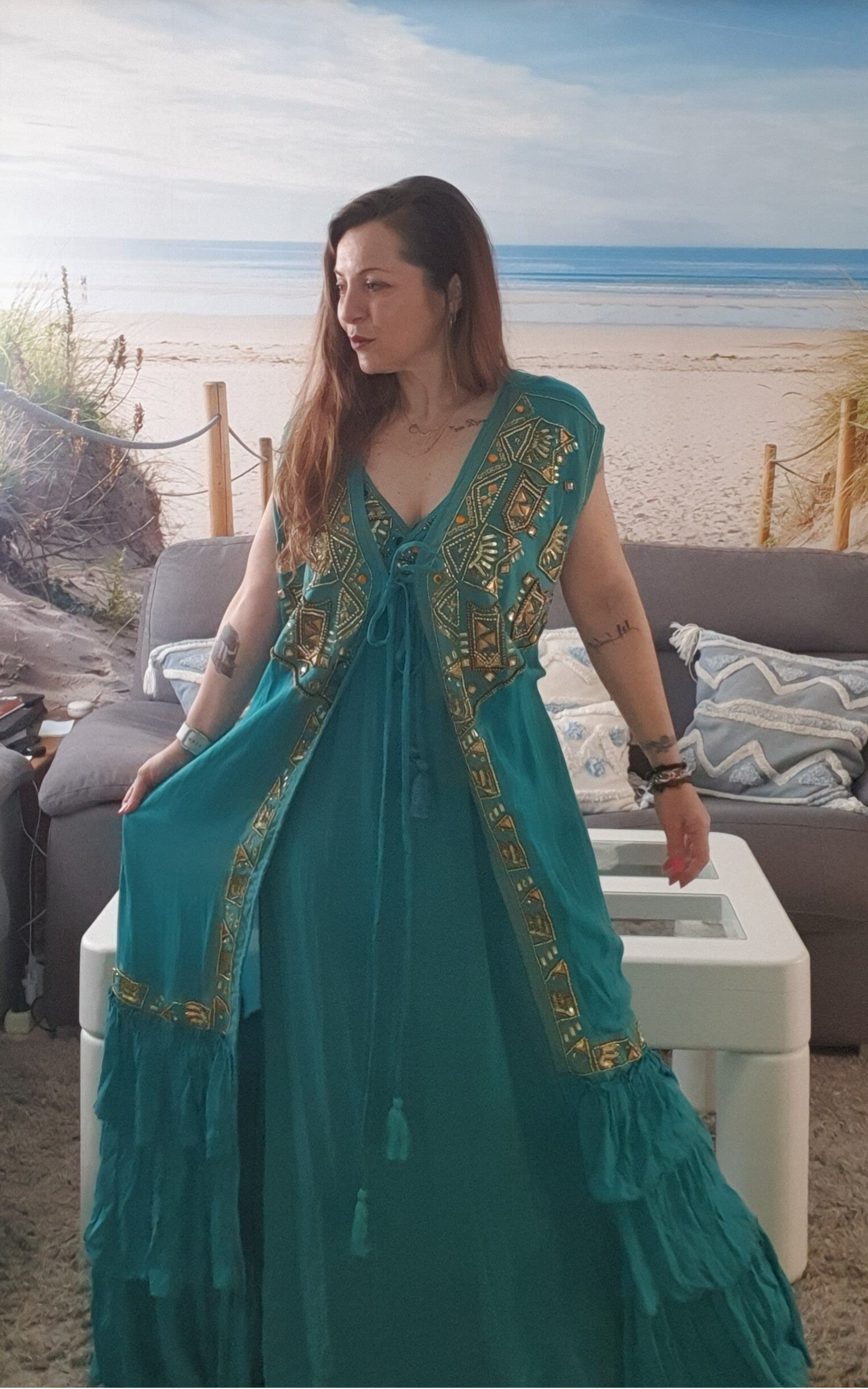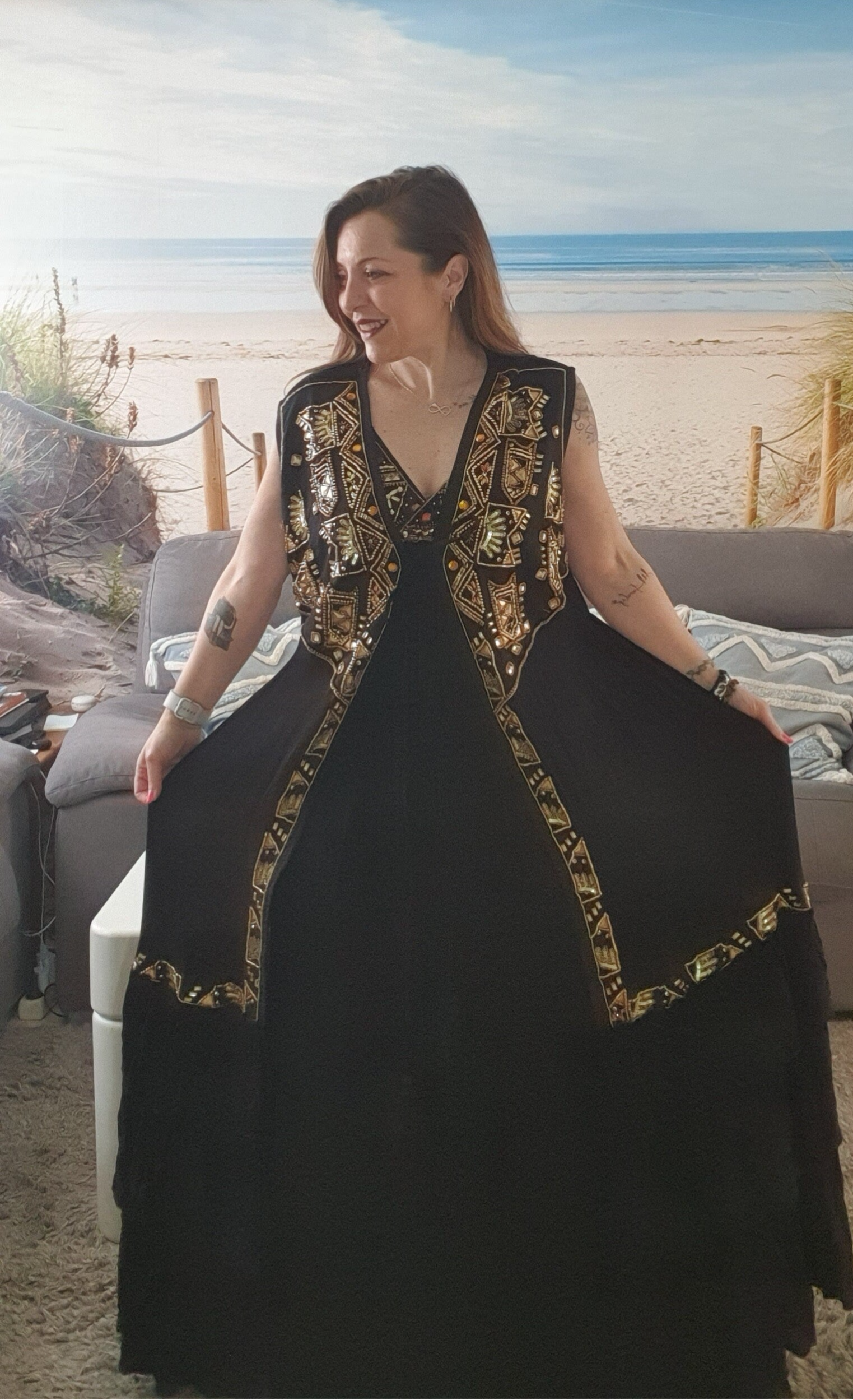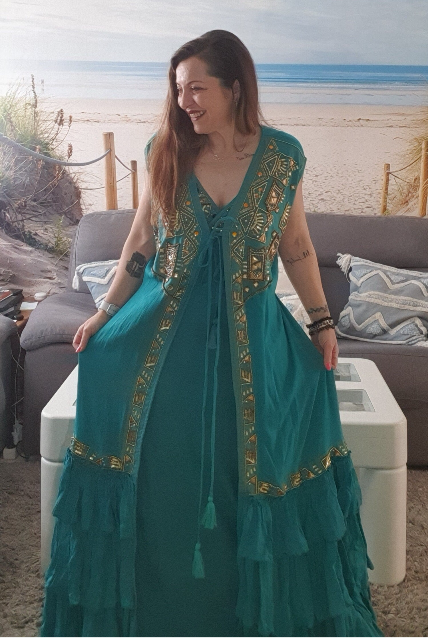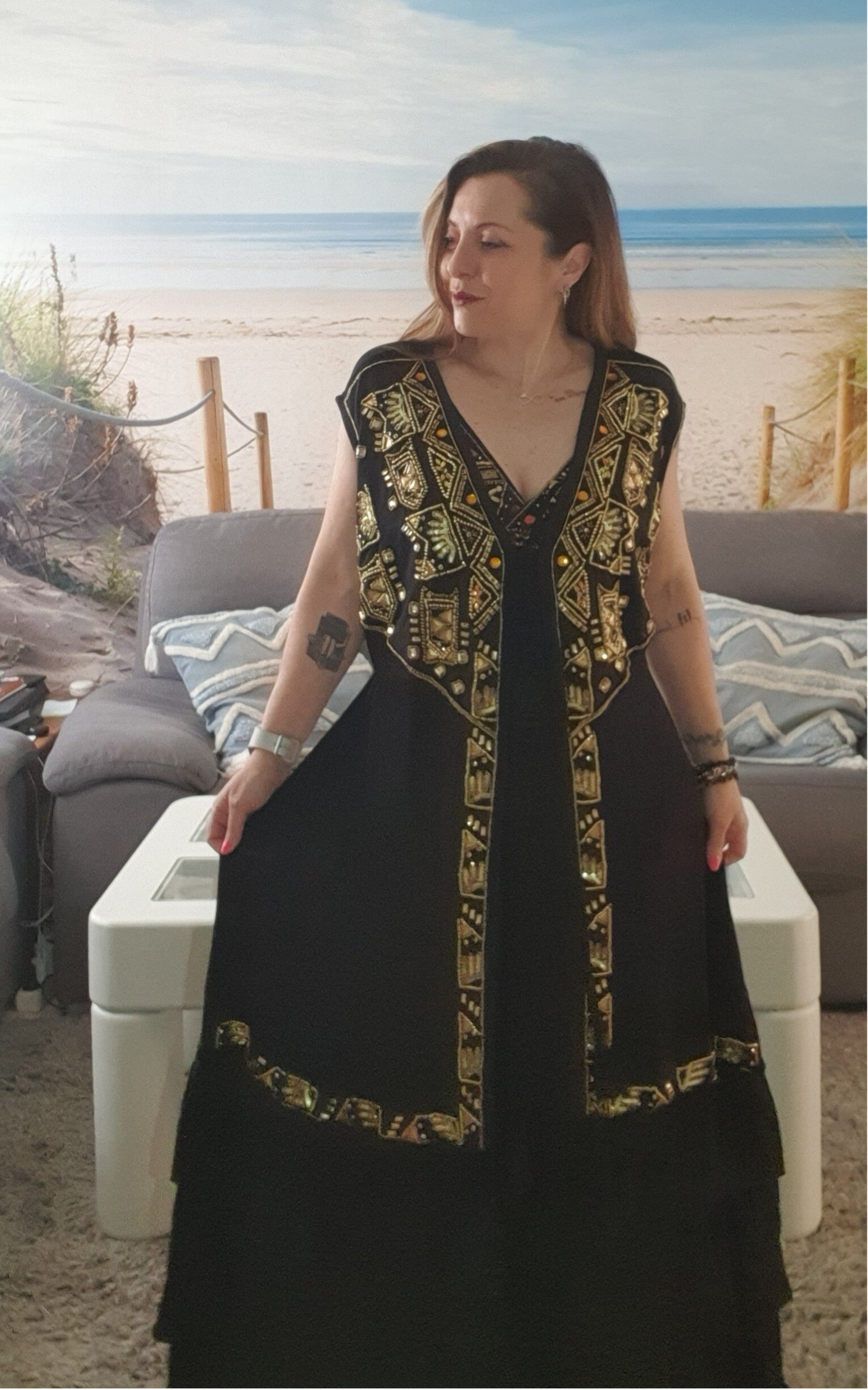 Confeccionado en viscosa, con lazada en el pecho , bordado con pedrería y abalorios , goma en la parte trasera a la altura de la cintura , capa de volantes en el bajo