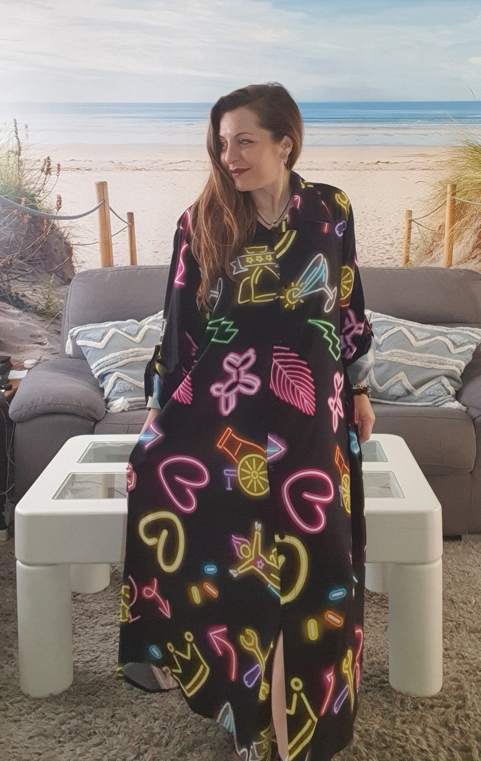 Confeccionado en algodón, estampados coloridos neón sobre fondo negro , estilo camisero , parte delantera abotonada hasta abajo , coste asimétrico con subida en laterales