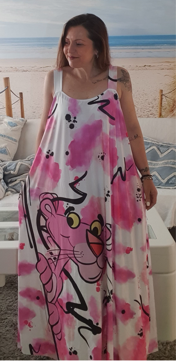 Vestido de la Pantera Rosa tejido punto frío, con tirante ancho .