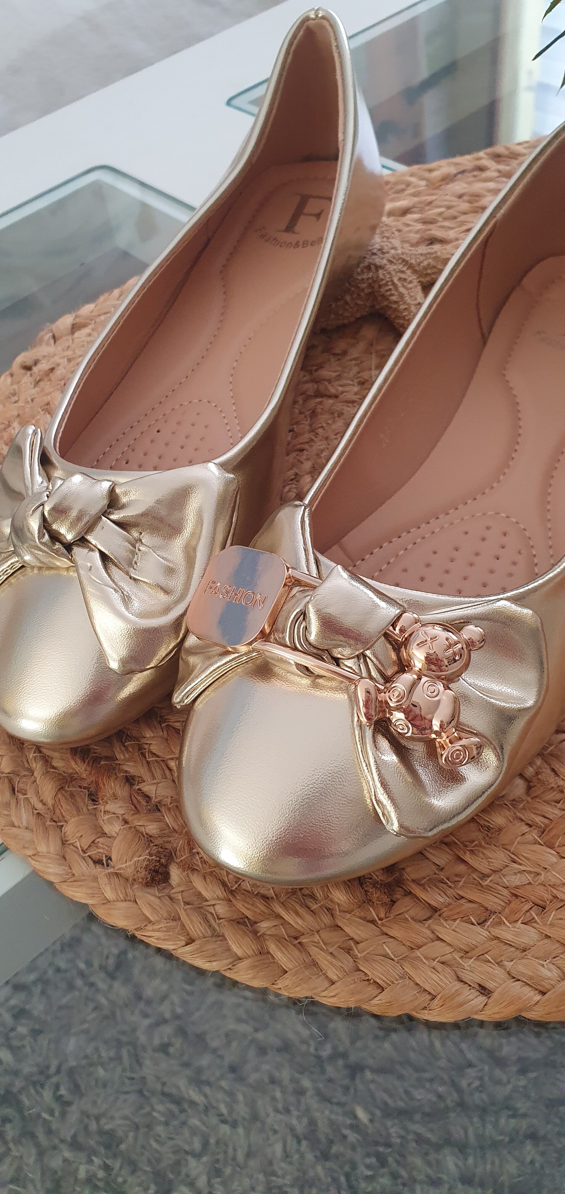Manoletinas doradas con lazo y detalle de oso , se puede quitar y dejar únicamente el lazo