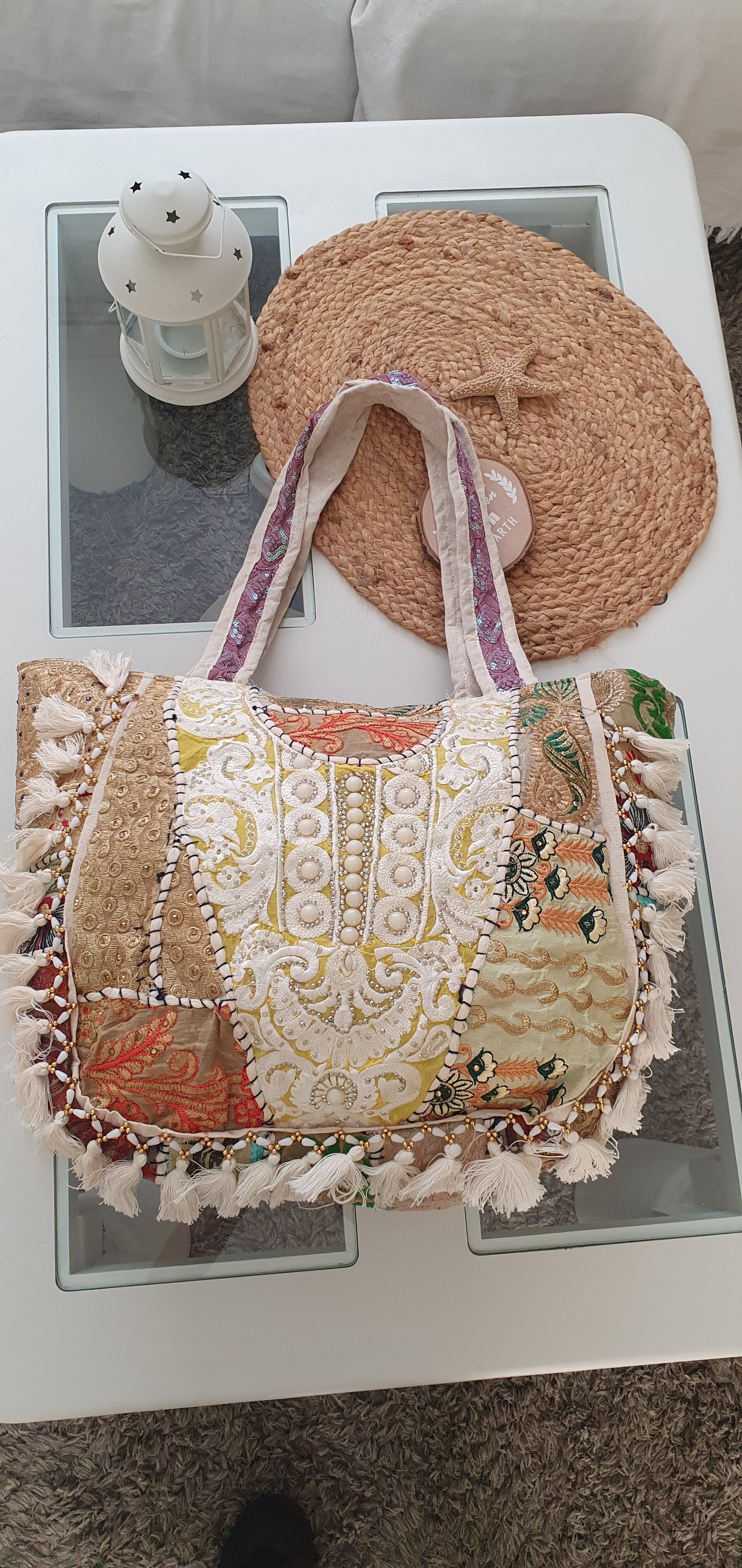 Bolso confeccionada y bordado a mano, 100% algodón, forrado interior, cierre con cremallera