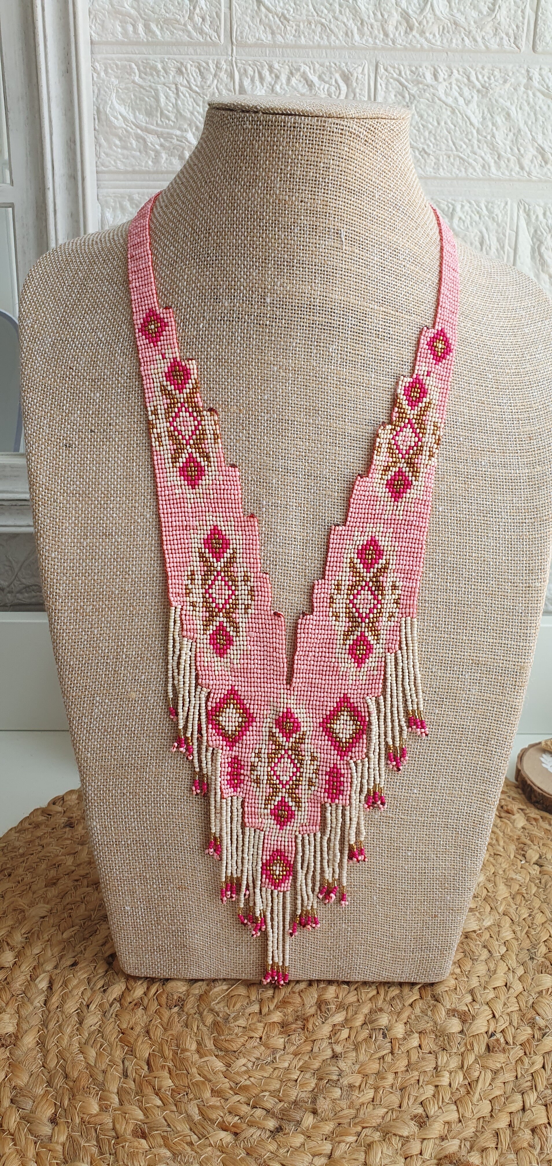 Collar hecho a mano con abalorios disponible en negro , rojo , azul y rosa , original escote en escalera , estilo ibicenco